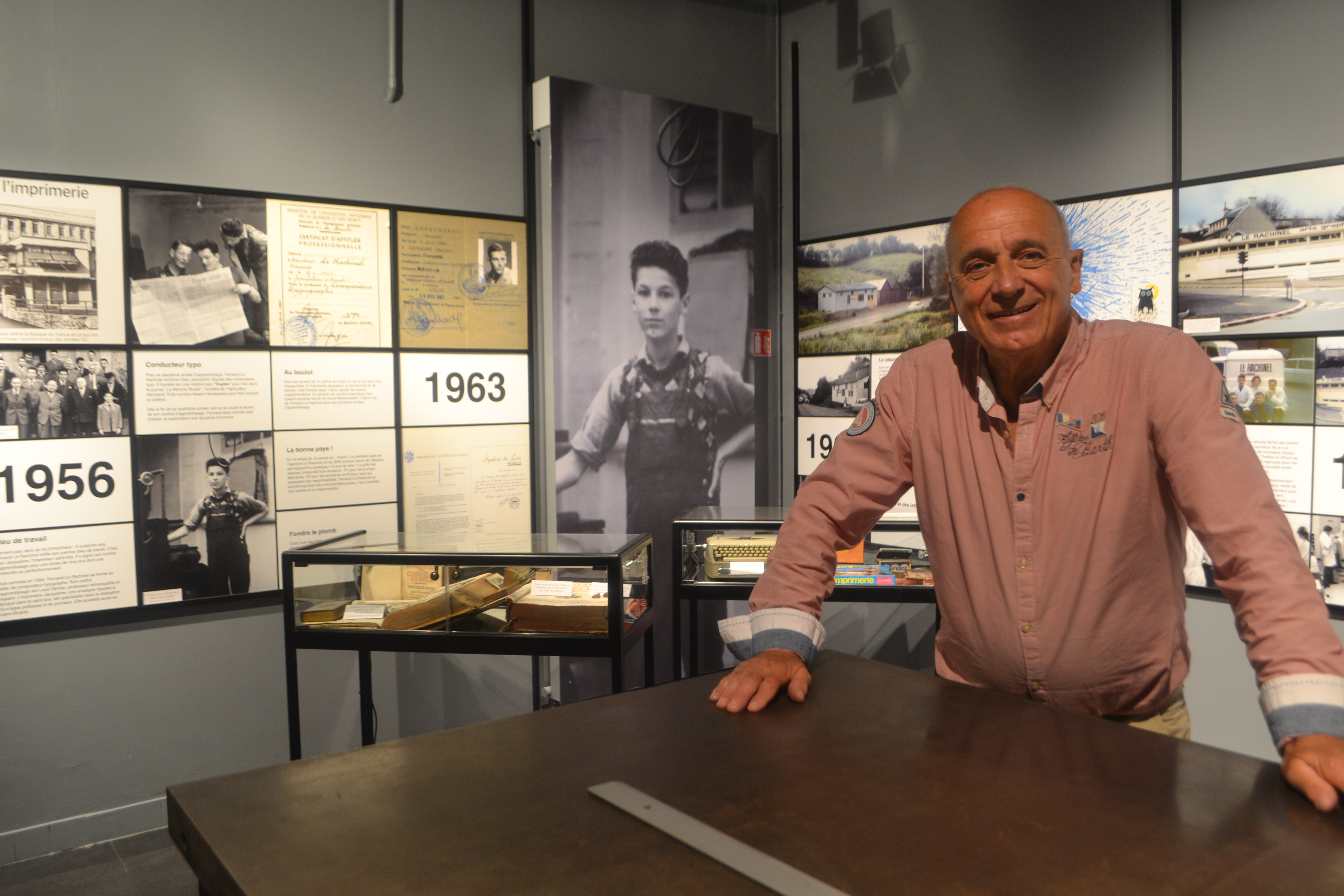 La salle d’accueil du musée retrace autour du « marbre » ce que furent les grands moments de la carrière professionnelle de Fernand Le Rachinel imprimeur normand, propriétaire des lieux et Meilleur Ouvrier de France : de ses débuts comme jeune apprenti chez Jacqueline, l’imprimeur Saint-Lois, jusqu’à la mise en œuvre de la SIAL- la Société d’Impression d’Art Le Rachinel – dont les anciens locaux installés dans les années 80 sur la zone d’activités de la Chevalerie abritent aujourd’hui ce musée exceptionnel.